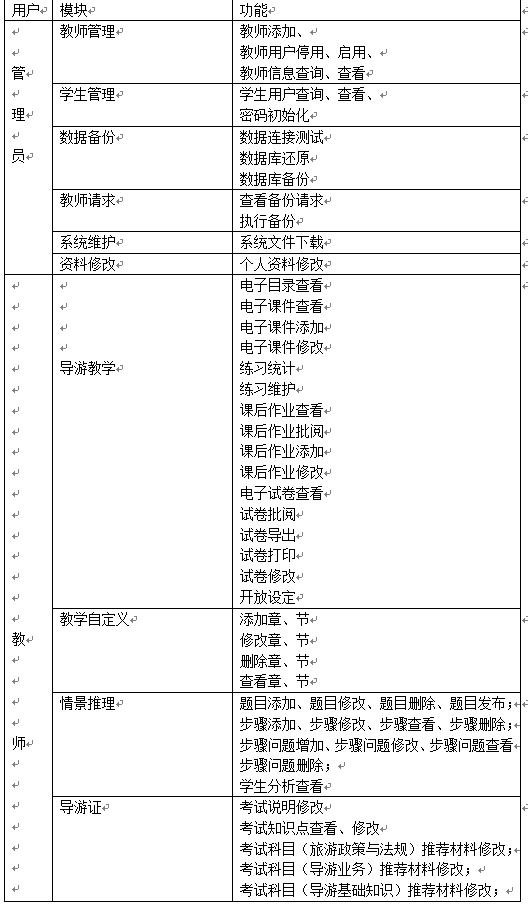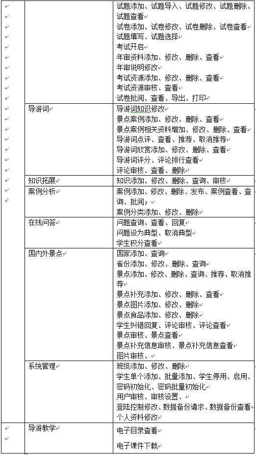 教師主(zhu)要功能包括(kuo)班級學生管(guan)(guan)理(li)(li)(li)(li)、導(dao)(dao)游(you)(you)基礎知(zhi)識(shi)管(guan)(guan)理(li)(li)(li)(li)、國內導(dao)(dao)游(you)(you)知(zhi)識(shi)管(guan)(guan)理(li)(li)(li)(li)、國外(wai)導(dao)(dao)游(you)(you)知(zhi)識(shi)管(guan)(guan)理(li)(li)(li)(li)、情景題目管(guan)(guan)理(li)(li)(li)(li)、導(dao)(dao)游(you)(you)證(zheng)考(kao)試(shi)資料管(guan)(guan)理(li)(li)(li)(li)、模擬考(kao)試(shi)、導(dao)(dao)游(you)(you)詞管(guan)(guan)理(li)(li)(li)(li)、導(dao)(dao)游(you)(you)案例管(guan)(guan)理(li)(li)(li)(li)、知(zhi)識(shi)拓展、案例分析管(guan)(guan)理(li)(li)(li)(li)、在線問答、國內外(wai)景點信(xin)息管(guan)(guan)理(li)(li)(li)(li)等。