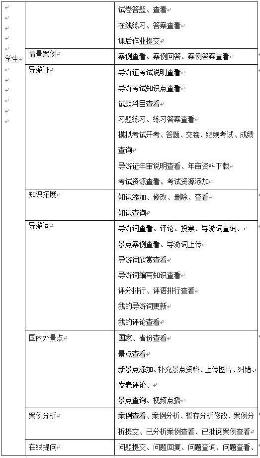 學(xue)(xue)(xue)生的(de)主要功能是導(dao)(dao)(dao)游(you)(you)教學(xue)(xue)(xue)知識的(de)學(xue)(xue)(xue)習(xi)(xi)、完(wan)成(cheng)情景推理中包含的(de)案例及題目、導(dao)(dao)(dao)游(you)(you)證考試(shi)學(xue)(xue)(xue)習(xi)(xi)及模擬考試(shi)、導(dao)(dao)(dao)游(you)(you)拓展知識學(xue)(xue)(xue)習(xi)(xi),同時可添加新的(de)知識供其他(ta)同學(xue)(xue)(xue)學(xue)(xue)(xue)習(xi)(xi)、導(dao)(dao)(dao)游(you)(you)詞(ci)(ci)學(xue)(xue)(xue)習(xi)(xi)并編寫導(dao)(dao)(dao)游(you)(you)詞(ci)(ci)、國內外(wai)景點學(xue)(xue)(xue)習(xi)(xi)、案例分析(xi)和(he)在線提(ti)問。