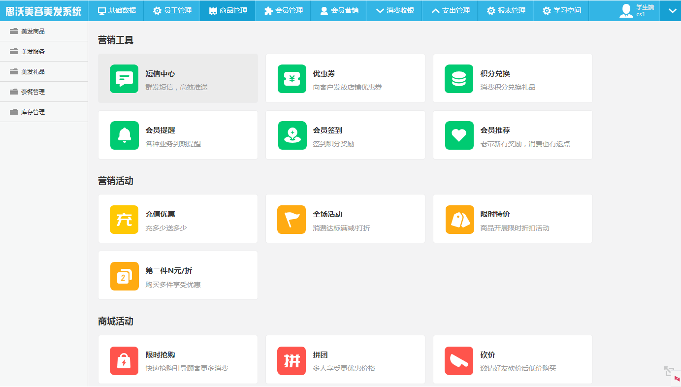 思沃美(mei)(mei)(mei)容美(mei)(mei)(mei)發模擬實訓系(xi)統(tong)分為管理員(yuan)、教師、學(xue)(xue)生(sheng)三種角色,教師設置基礎數據及考(kao)(kao)核項分數,學(xue)(xue)生(sheng)真(zhen)實模擬美(mei)(mei)(mei)容美(mei)(mei)(mei)發實際操作(zuo)功能(neng),系(xi)統(tong)自動(dong)給出評分,生(sheng)成(cheng)考(kao)(kao)核成(cheng)績,供教師進行成(cheng)績導(dao)出,教師還(huan)可跳轉到學(xue)(xue)生(sheng)端查看學(xue)(xue)生(sheng)的操作(zuo)情況。 系(xi)統(tong)涵蓋(gai)店鋪員(yuan)工(gong)、商品(pin)、會(hui)員(yuan)、營銷(xiao)、消費(fei)收(shou)銀、費(fei)用(yong)支出、報表統(tong)計等主要(yao)功能(neng),還(huan)提供了豐富(fu)的美(mei)(mei)(mei)容美(mei)(mei)(mei)發資源(yuan)庫及在(zai)線考(kao)(kao)試等功能(neng)。